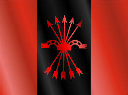 Emblema de la Falange. Con el yugo y las flechas juntos.